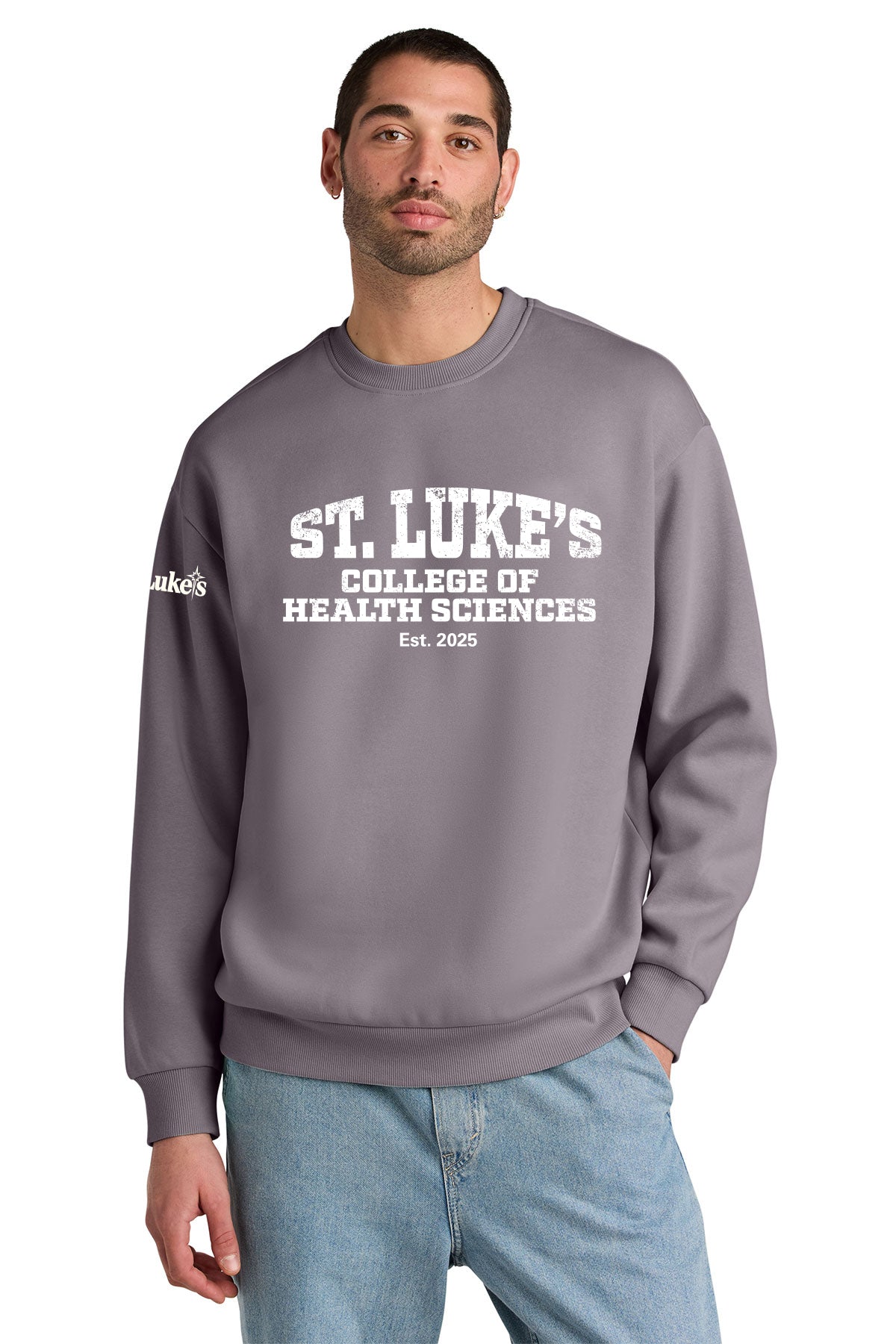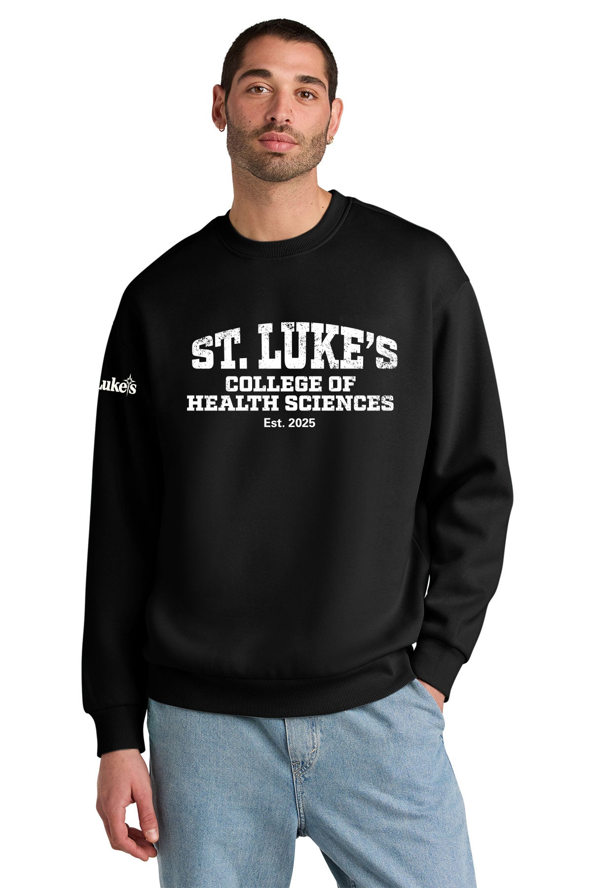- St. Luke's screen printing (Collegiate logo on the front, St Luke's brand on the sleeve)
